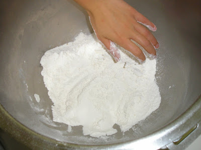 1) We buried the yeast into the flour. This helps protect the yeast when we next added the salt and conditioner.